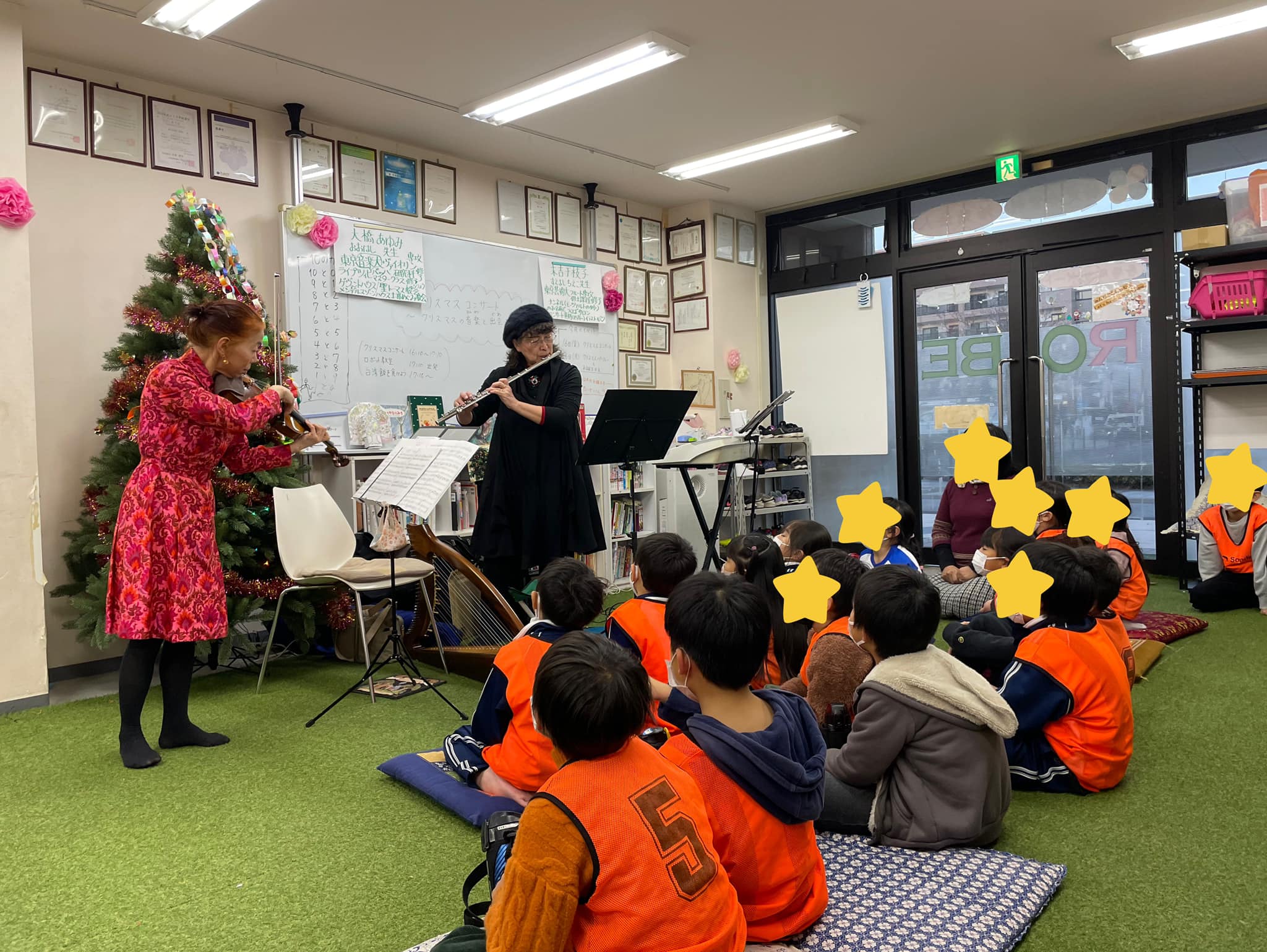 クリスマスソングに始終和やかな雰囲気が流れる中、子ども達はバイオリンとハーブの音に夢中になっていました