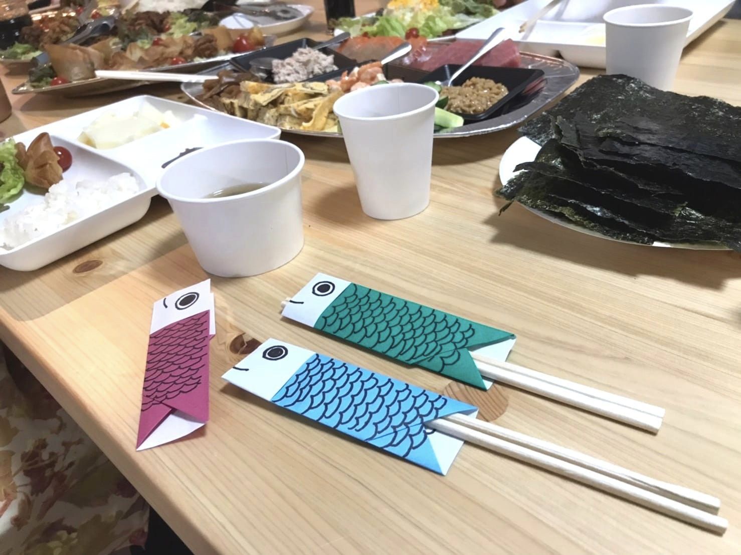メニューは手巻き寿司、唐揚げ、ポテトサラダ、兜型の春巻き、柏餅、牛乳寒天、しじみの味噌汁