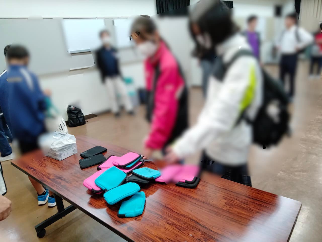 帰りには、個人の方からご寄付いただいたミニポーチを。携帯や10キーとかにちょうどいい!皆、喜んで持って帰っていきました。