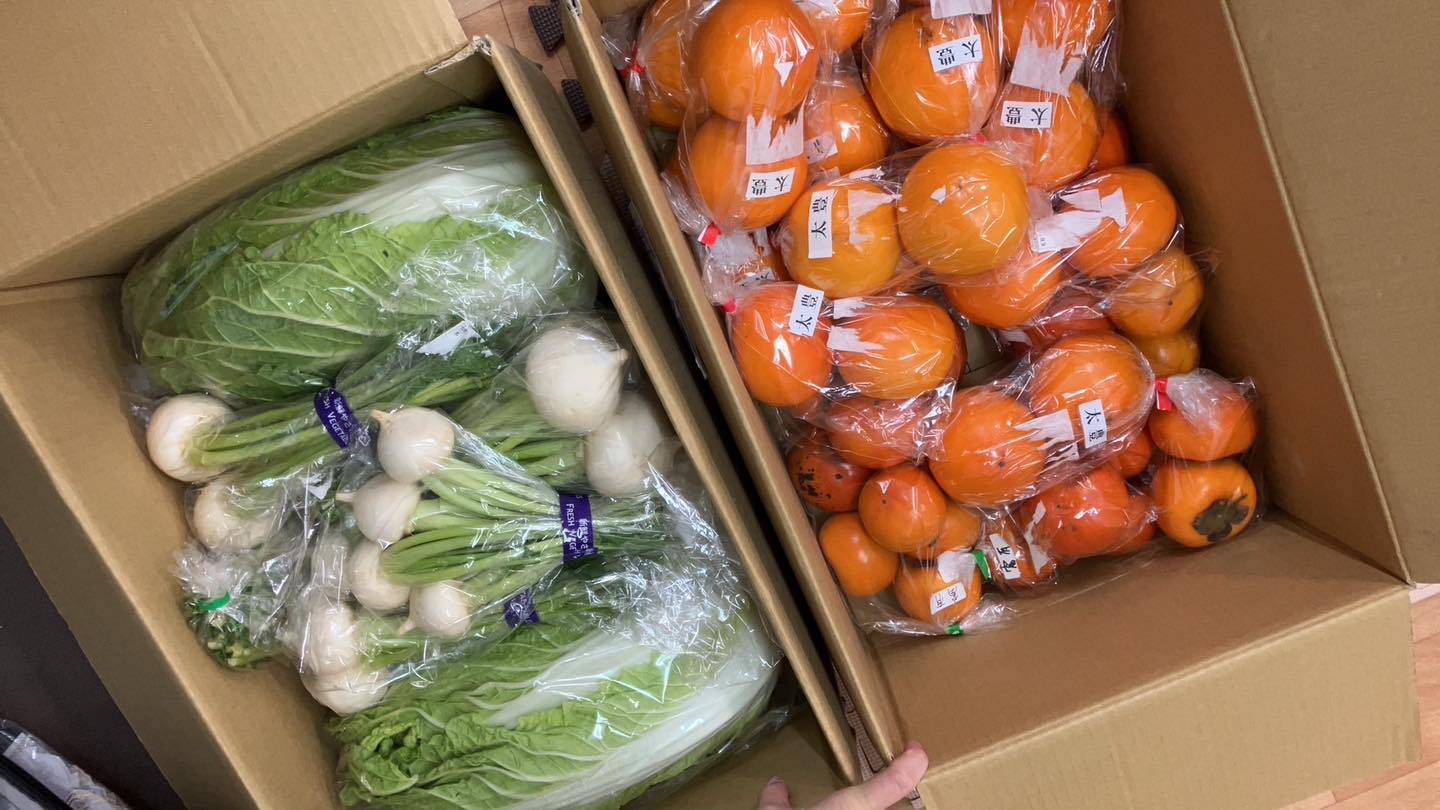 つくば分析センター様よりファーマーズマーケットなだろう様の野菜と柿のご寄付をいただきました。いつも大変助かっております。おかげさまで子どもたちに美味しい野菜料理が提供できます。