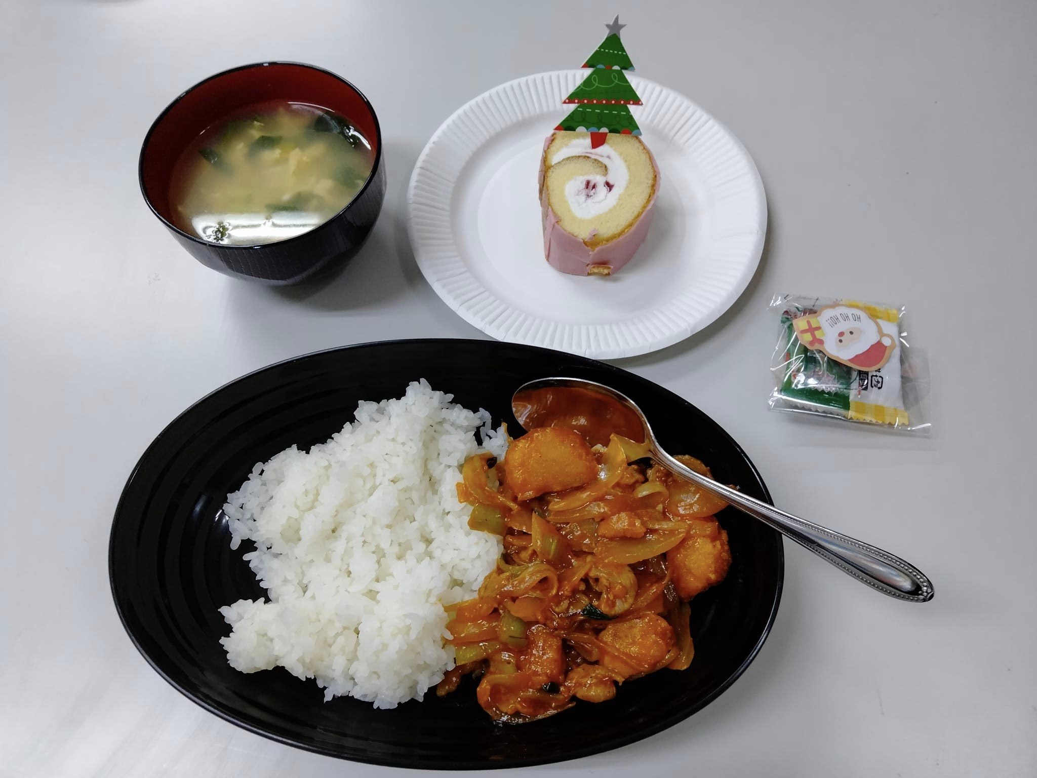 この日も子ども食堂の美味しい食事のご提供がありました。クリスマスバージョンでロールケーキのデザートもお菓子も頂きました。いつもありがとうございます。