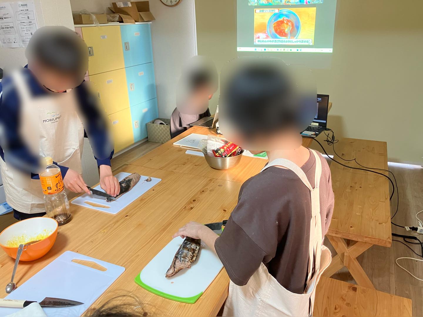 東北から送られて来た魚介の食品を、オンライン授業を受けながら調理します。