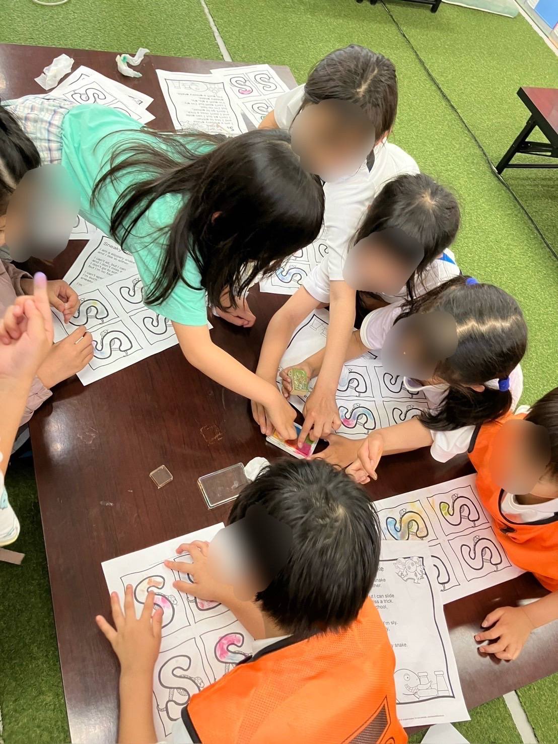 低学年のプリントワークでは、指スタンプでアルファベットを覚えました♪