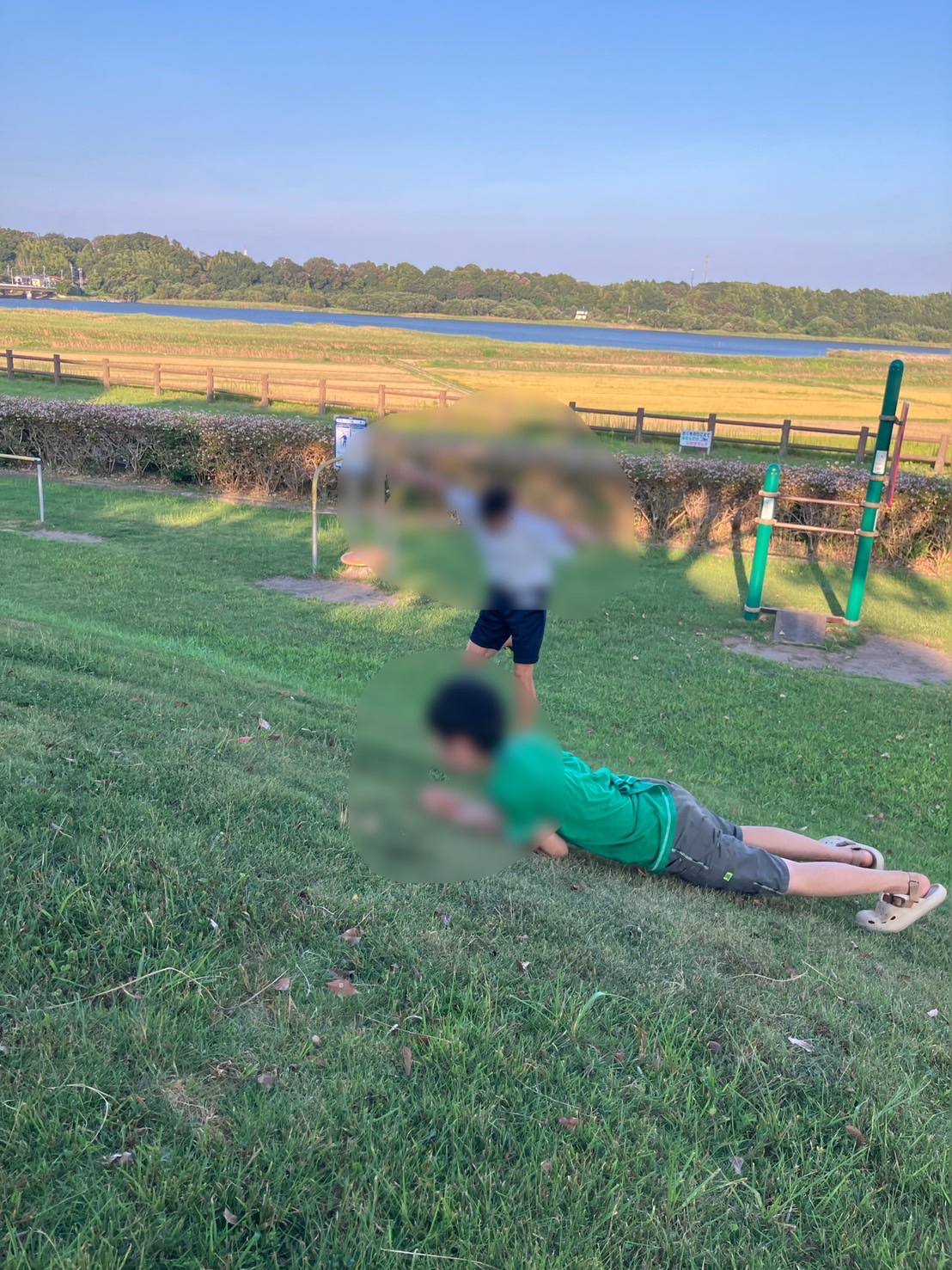 たくさん遊具で遊んで、草の丘を転がって…
