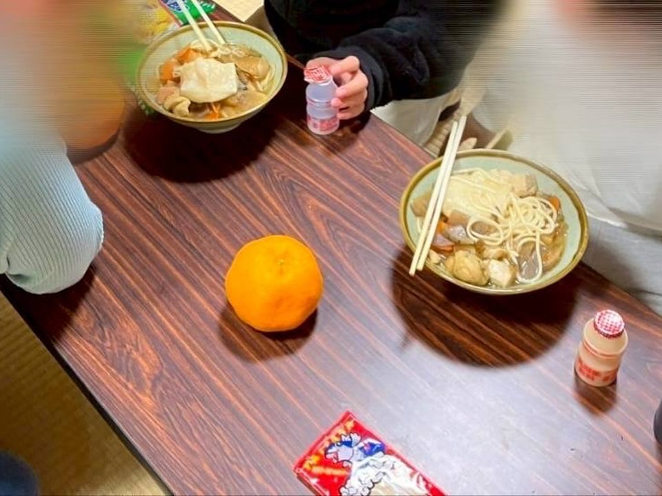 けんちんうどん。みかん。ヤクルト、お菓子。