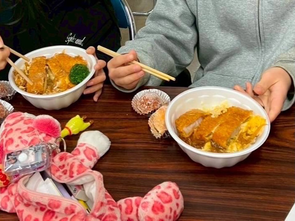 カツ丼、お汁、栗きんとん、ドーナツ。